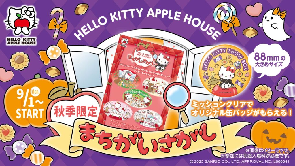 りんご型展望シアター「HELLO KITTY APPLE HOUSE」内の360度シアターに映し出されたハローキティの可愛いイラストとキットを照らし合わせて、まちがいを探すイベントです。クリアすると、本イベント限定オリジナル缶バッジをプレゼント!家族や友達と一緒に楽しむのにぴったり。