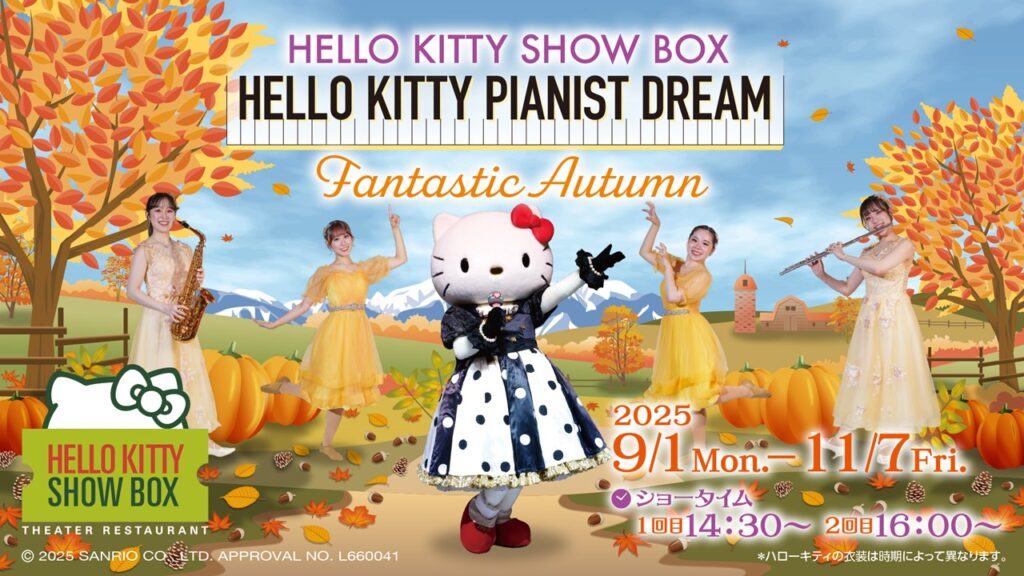 「HELLO KITTY SHOW BOX」はハローキティが登場するショーを観ながらお食事を愉しめるレストラン。クラシックから童謡まで、秋にピッタリなナンバーをダンサーとミュージシャンが美しく表現。さらに、ハローキティが歌とダンスの生パフォーマンスをお届け!秋の様々な風景が華やかに移り変わる、大迫力の背景スクリーン映像も圧巻です。ショーの後には、期間限定の背景をバックにハローキティとステージ上でお写真も撮れるグリーティングタイムも!