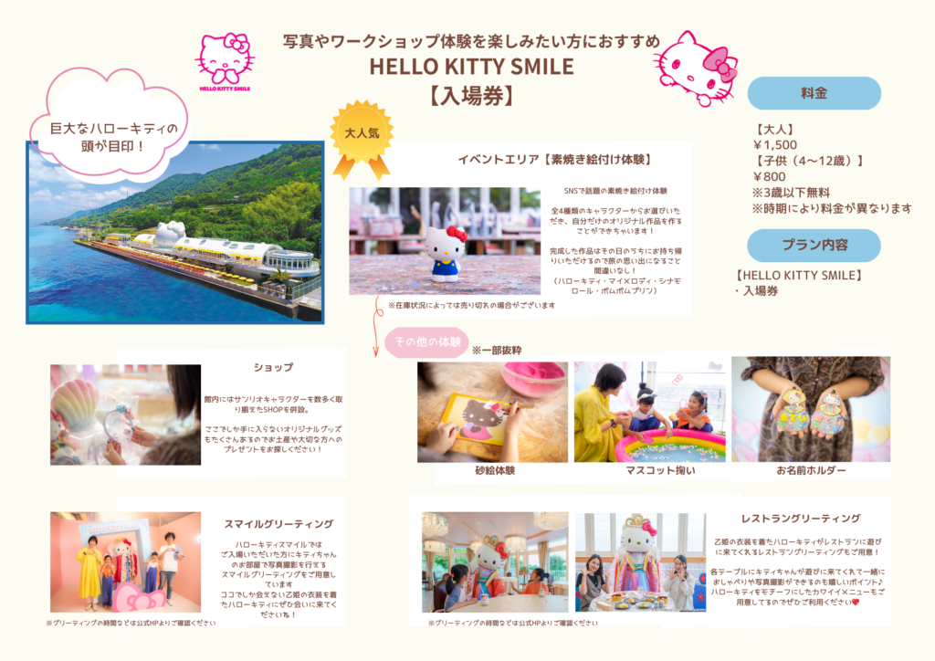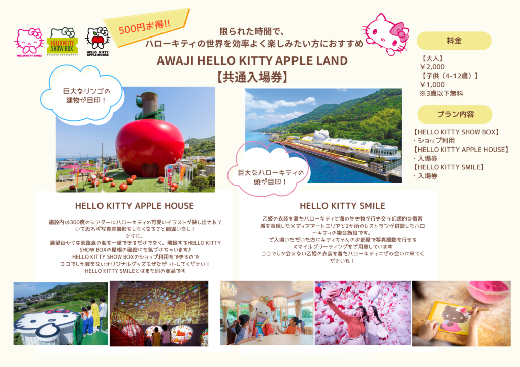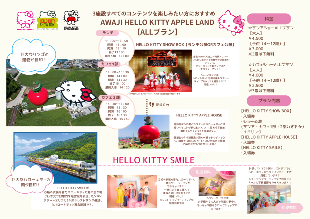 上記2つのプラン内容に、姉妹店舗「HELLO KITTY SMILE」の入場券がセットになった淡路島にあるハローキティの3つの施設を大満喫できるプランです!