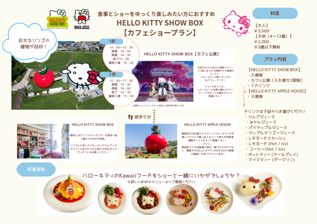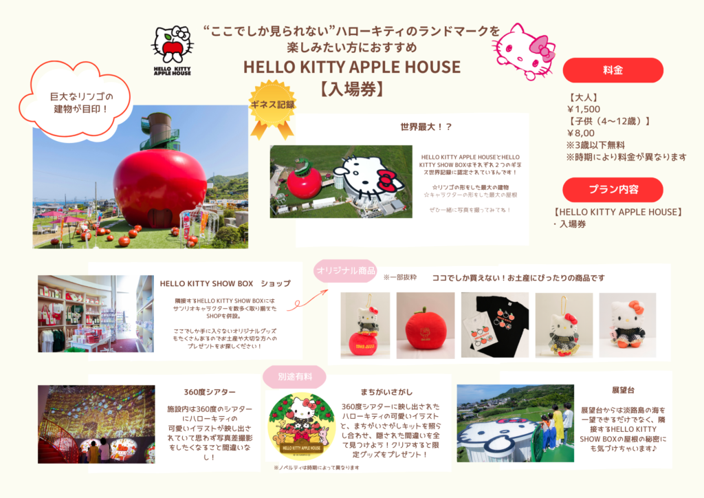 HELLO KITTY APPLE HOUSEに隣接するHELLO KITTY SHOW BOXのショップ利用もできるため、淡路島にある3つのハローキティの施設を限られた時間でもお楽しみいただけます。また、HELLO KITTY SMILEとHELLO KITTY SHOW BOXのショップには異なる各施設のオリジナル商品が置いてあるため、淡路島のオリジナルキティちゃんグッズをお求めの方は断然共通入場券がおすすめです!