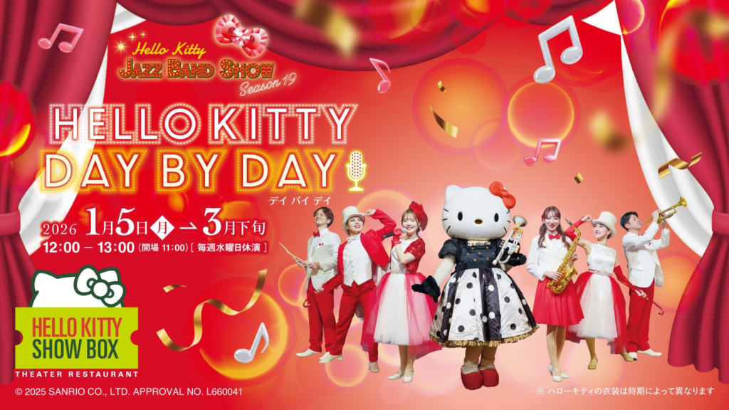 大人気ランチタイムショー「HELLO KITTY JAZZ BAND SHOW」の最新作「Hello Kitty Day By Day!!」。思わず踊り出したくなるポップな楽曲を生演奏と共にお届けいたします♪