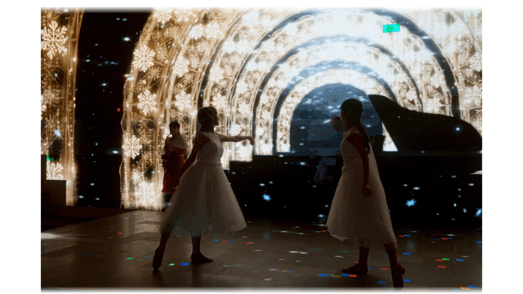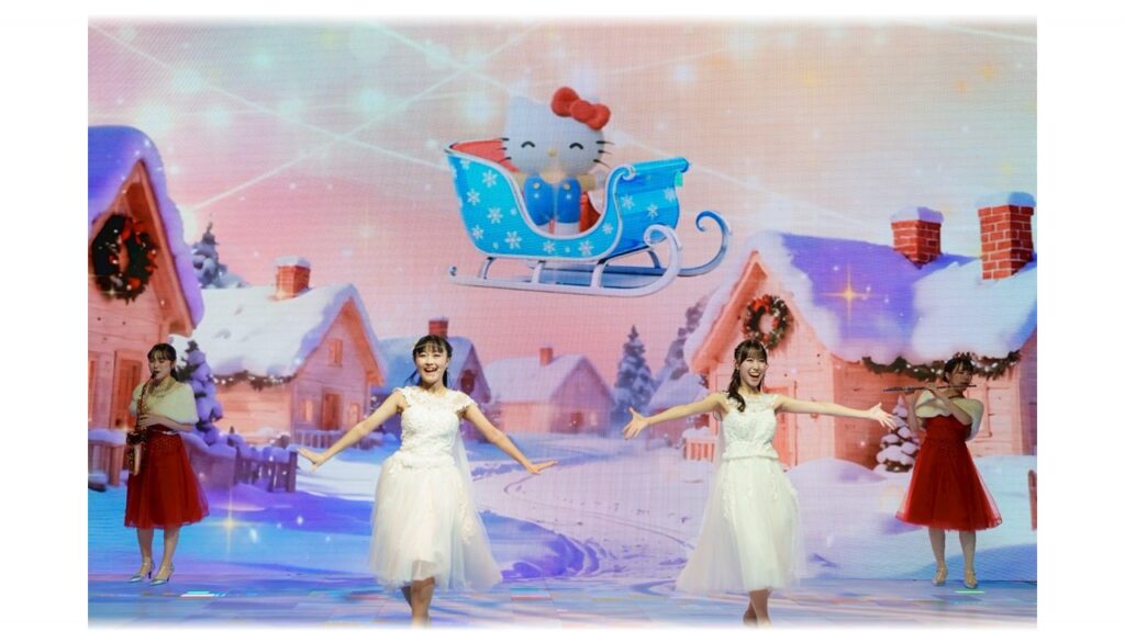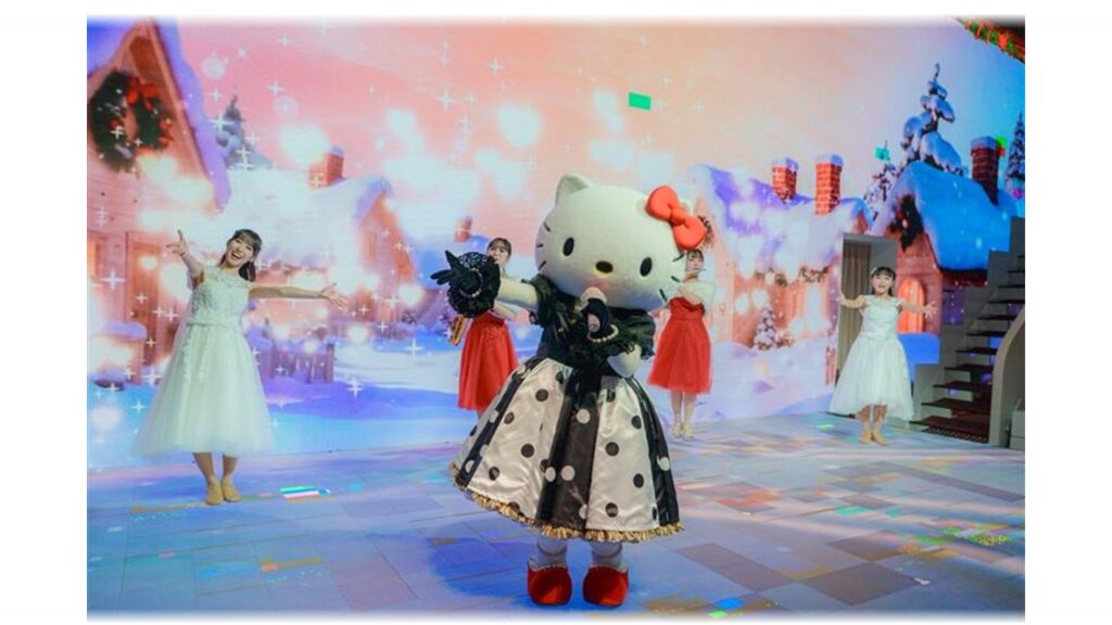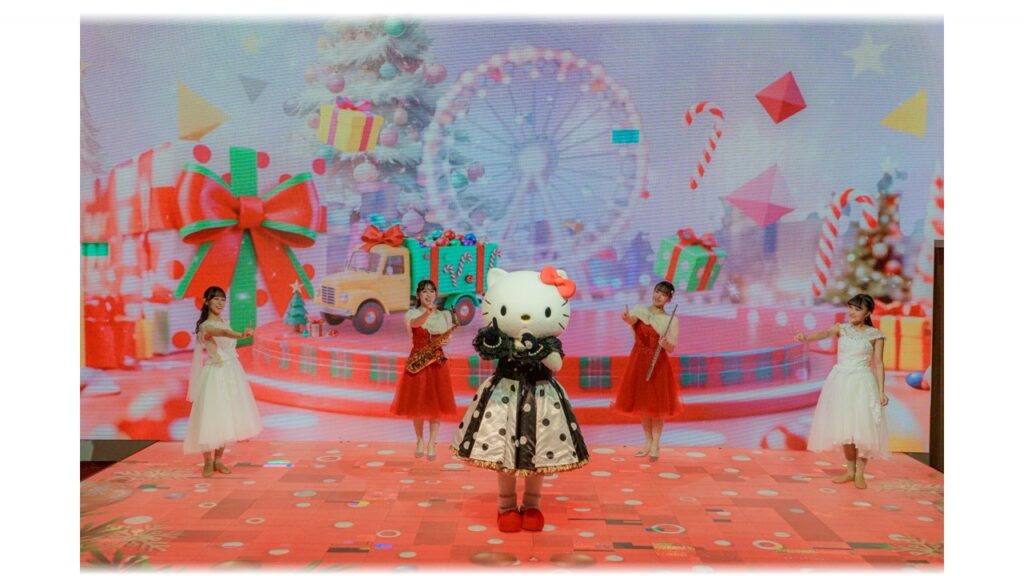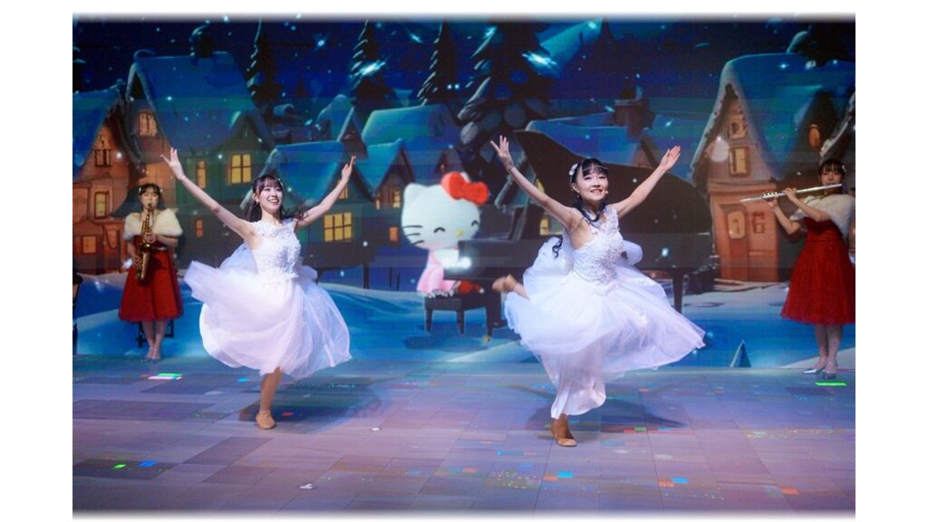 クリスマスを感じられる胸躍る時間をハローキティとダンサー、ミュージシャンがお届け。このショーを観ることができるのはこの季節だけ!