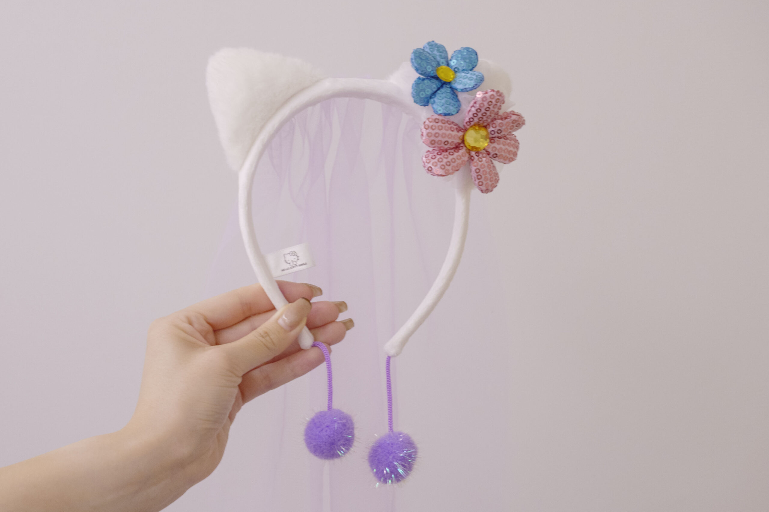 紫色のオーガンジーがきらめいていて、カチューシャの横には「HELLO KITTY SMILE」のロゴ入りでとてもかわいいデザインです♡