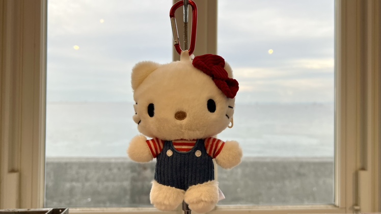 こちらは、ハローキティがデニム風のオーバーオールに赤いボーダーのトップスを合わせた、カジュアルで愛らしいスタイルのぬいぐるみマスコットです✨